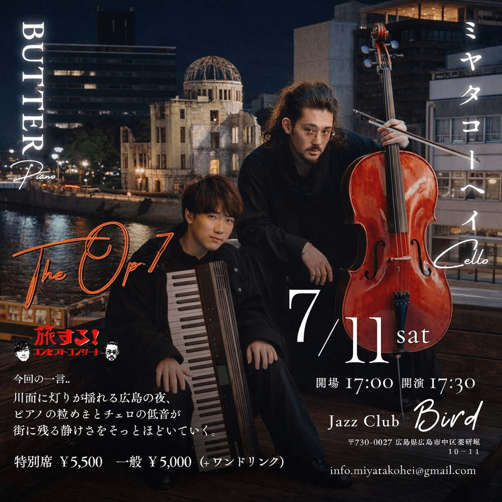クラシックの反逆者(チェロ)ミヤタコーヘイとピアニスト バター(小畑和彰)が2年ぶりに広島「Jazz Club Bird」へ