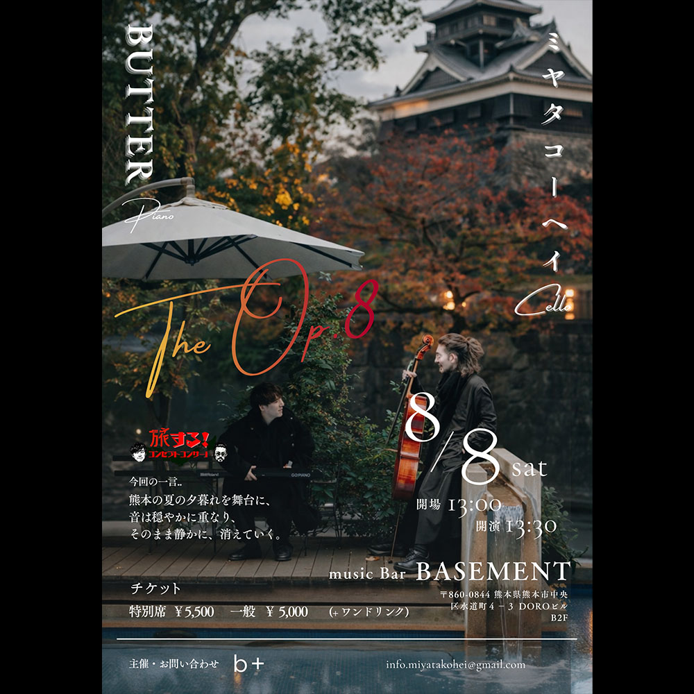 チェリスト ミヤタコーヘイとピアニスト バター(小畑和彰)が初の熊本へ!